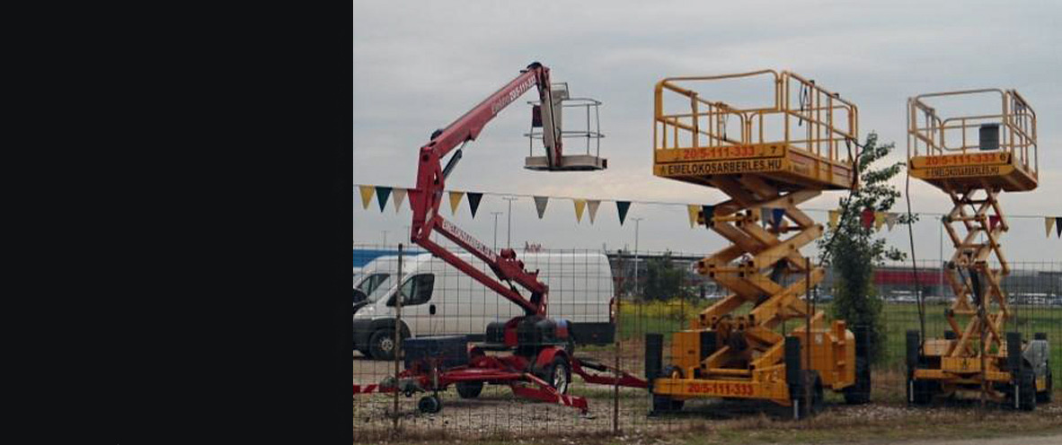 Gépparkunk között találhatók karos, teleszkópos, ollós, oszlopos(elekromos és dízel), önjáró és vontatható kosaras személyi emelők többféle emelési magassággal, 40 méterig. Az emelőgépeket az ország egész területére szállítjuk.